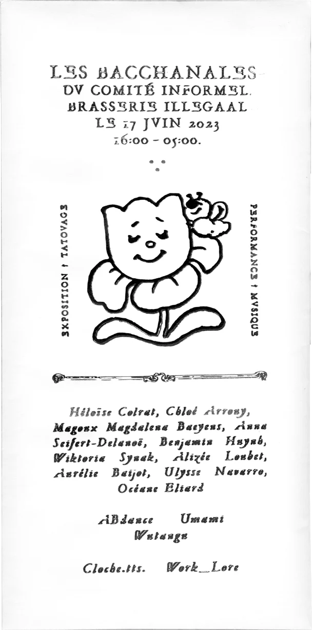 A festive, sensitive, and sprawling event that took place on June 17, 2023, at Brasserie Illegaal in Brussels, initiated and curated by Comité Informel.Illustrations and visual identity system designed in collaboration with Geoffrey Bourgeois.