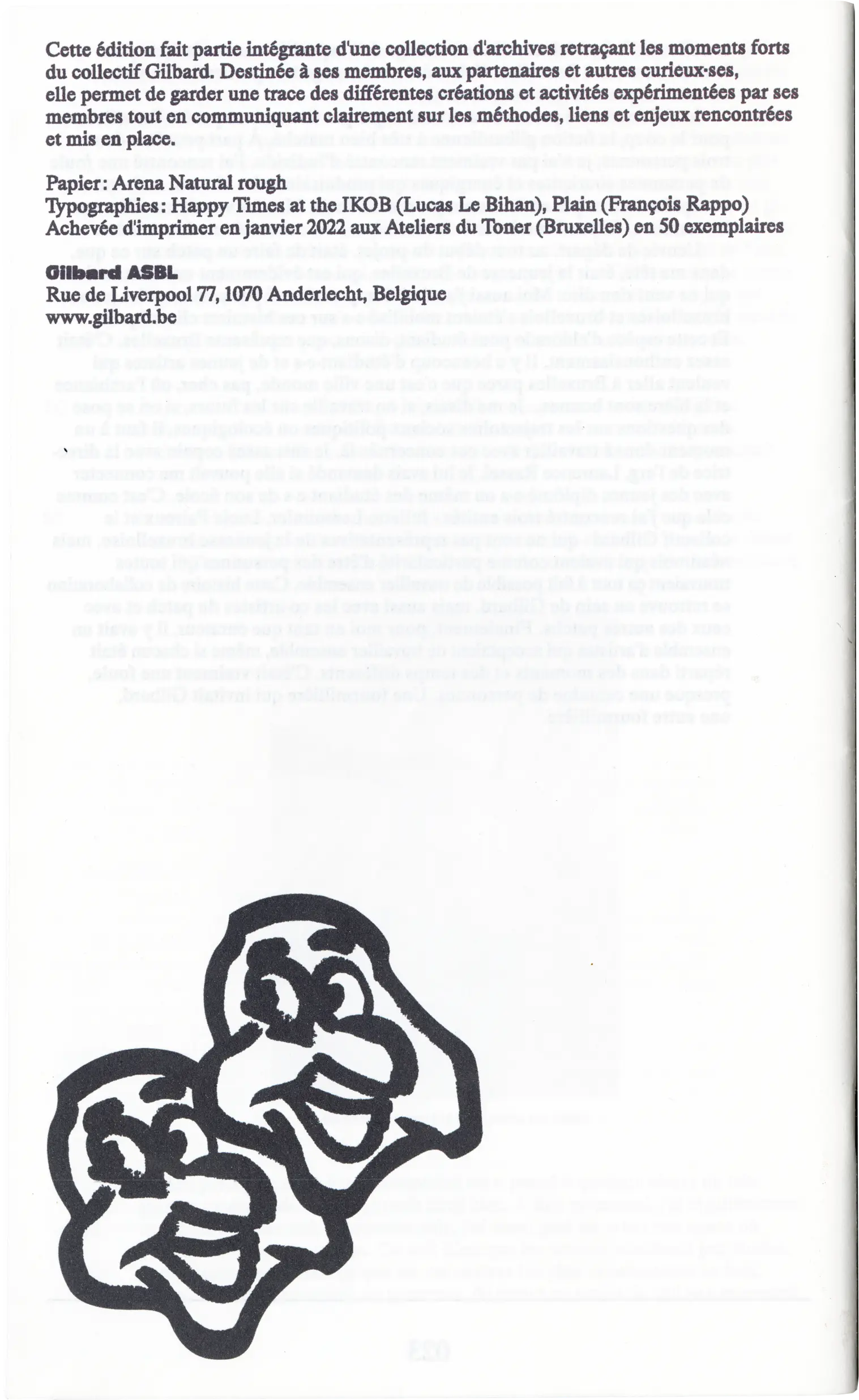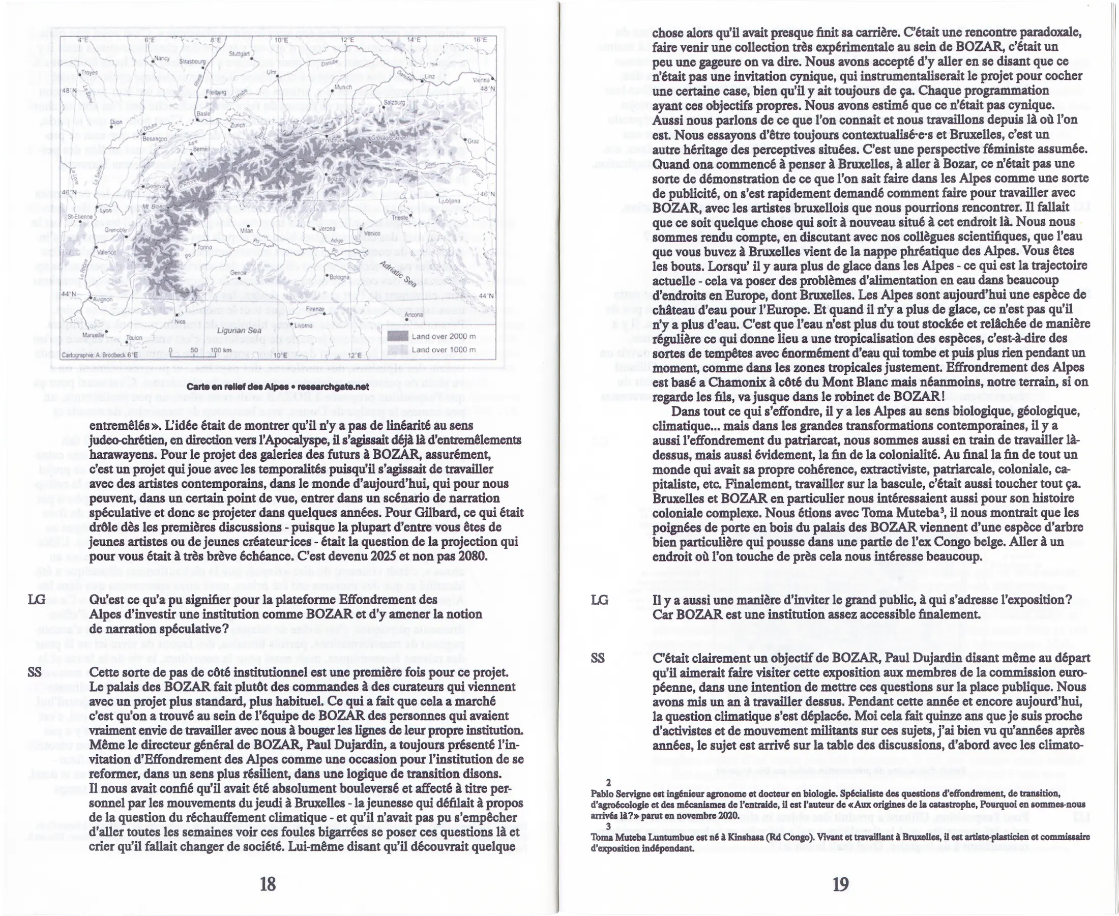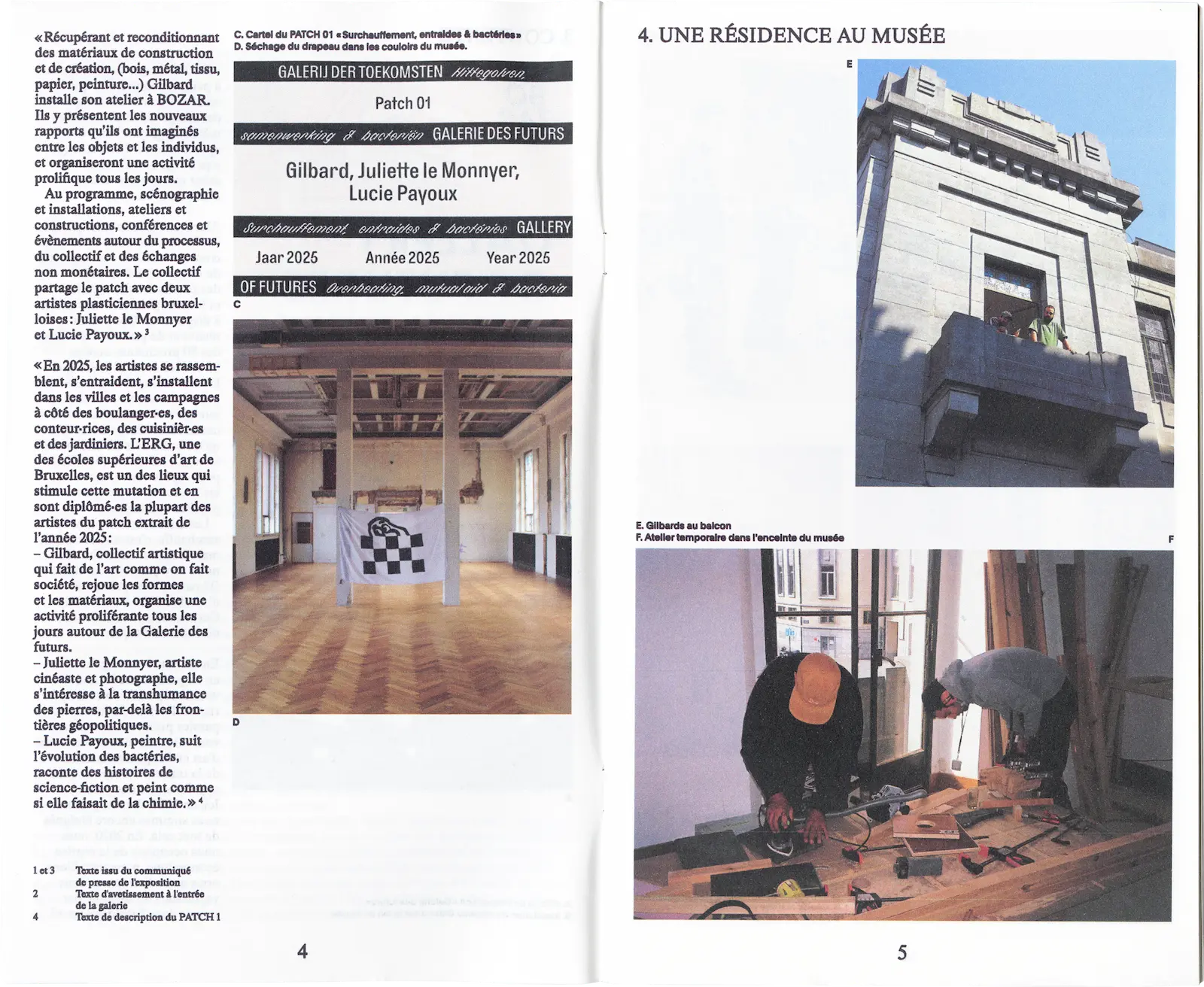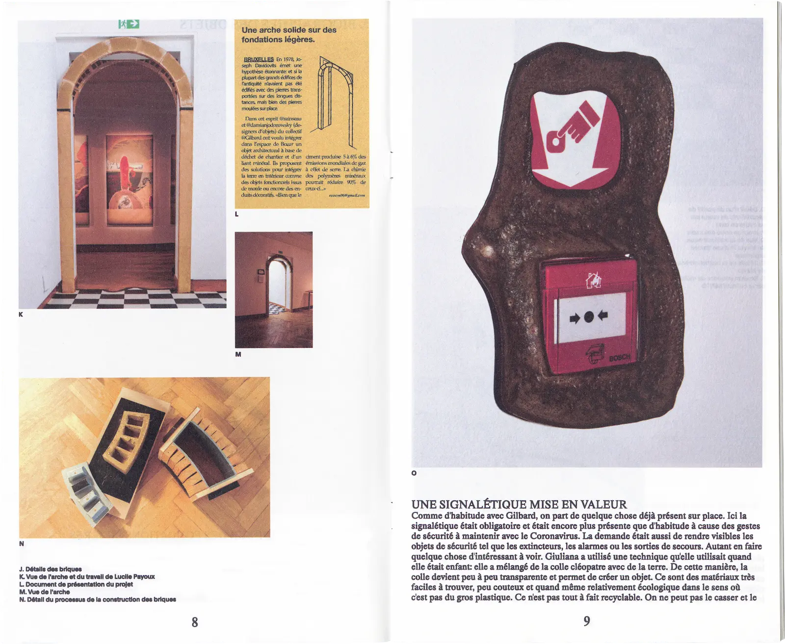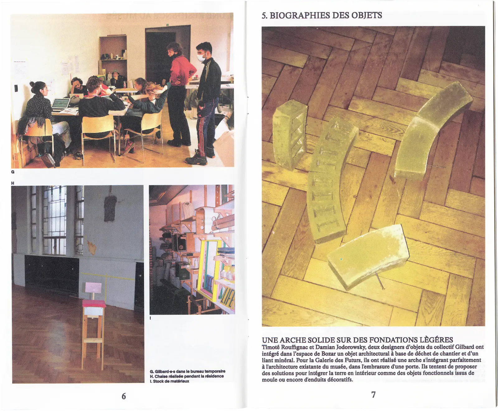 Gilbard, a collective of designers and artists in Anderlecht, Brussels, works with reused materials to create local projects. In 2021, the Effondrement des Alpes platform invited them to participate in La Galerie des Futurs at BOZAR and temporarily relocate their offices for a residency. A catalog documenting the event was produced, featuring the objects created, exhibition excerpts, and an interview with Stéphane Sauzedde, a founding member of Effondrement des Alpes.