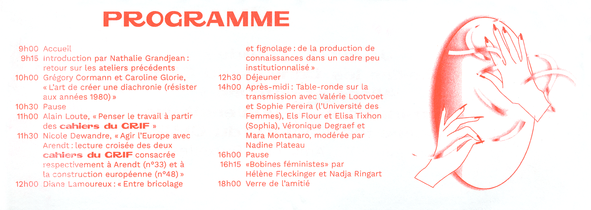 The transdisciplinary research group Relire les cahiers du GRIF focuses on revisiting Cahiers du GRIF, the first Francophone European feminist journal, originally published in 1973. In 2019, the group organized a seminar, inviting participants to read and study select issues.