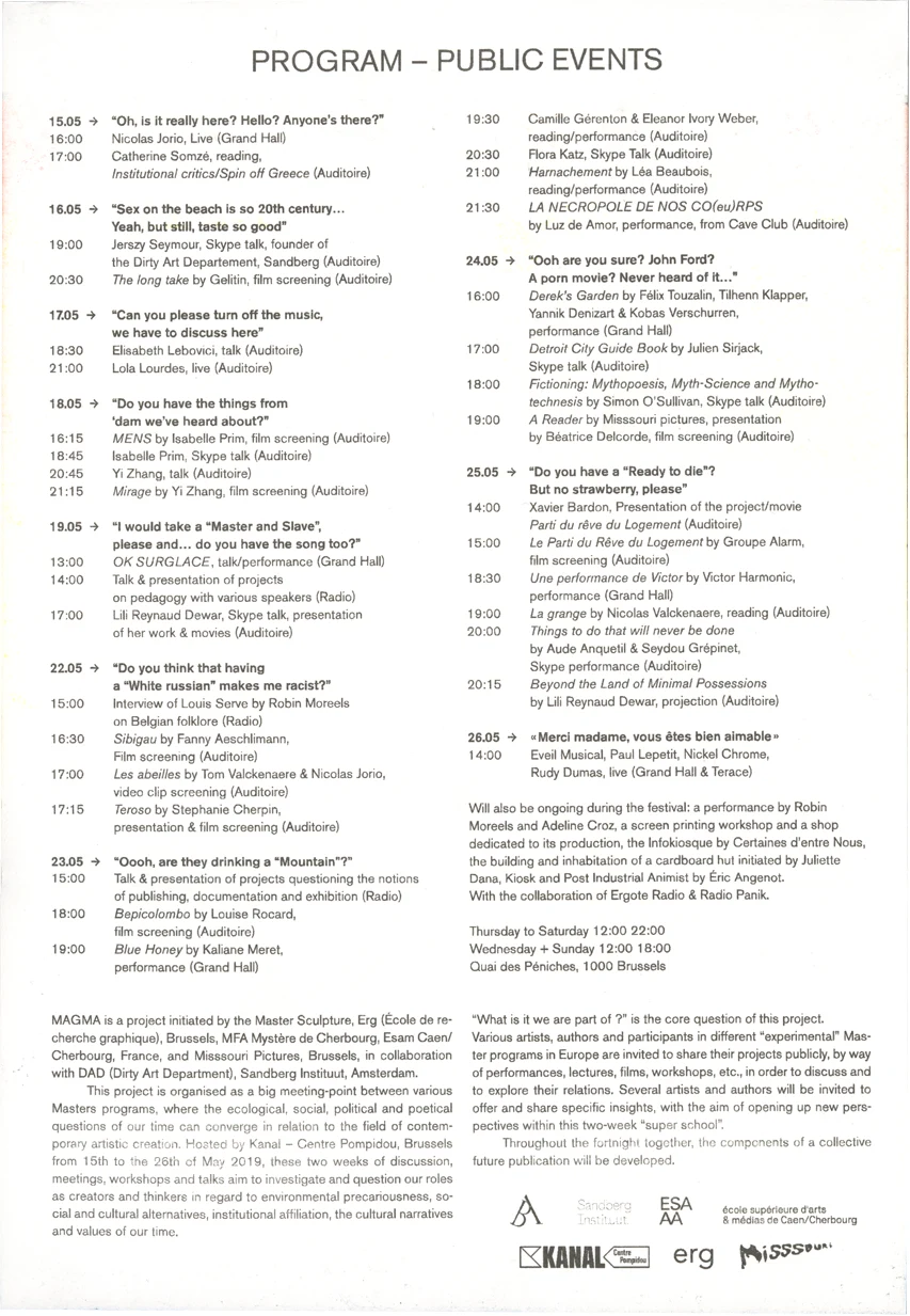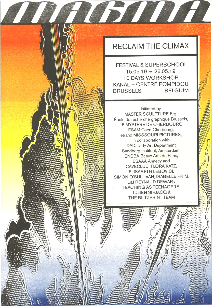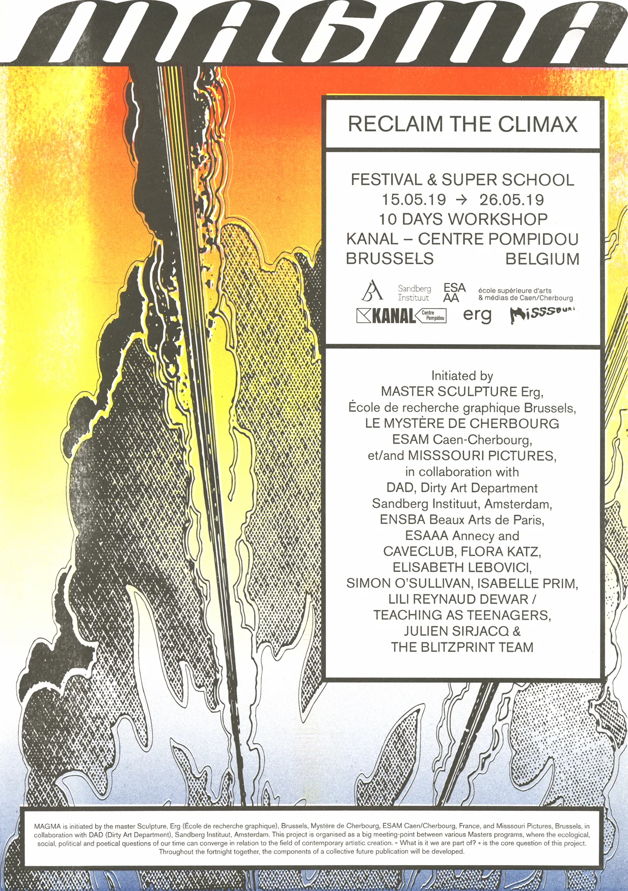 In june 2019 at Kanal — Centre Pompidou in Brussels took place Magma festival & super school, a big meeting-point between various Masters programs, where the ecological, social, political and poetical questions of our time can converge in relation to the field of contemporary artistic creation.