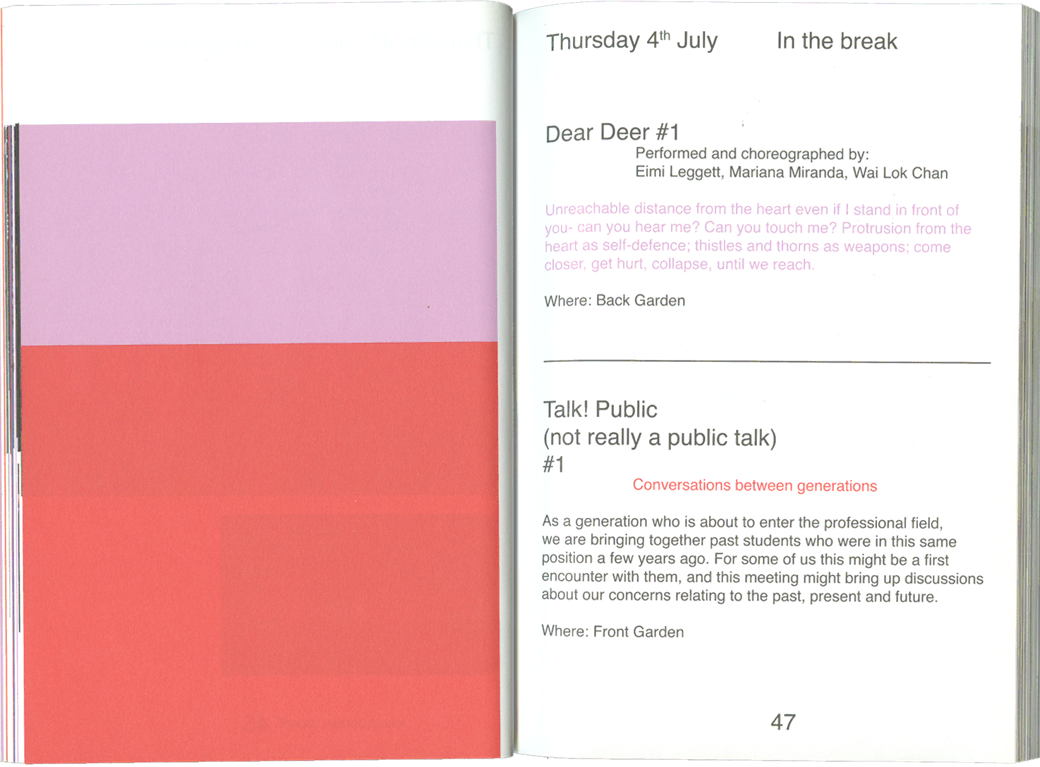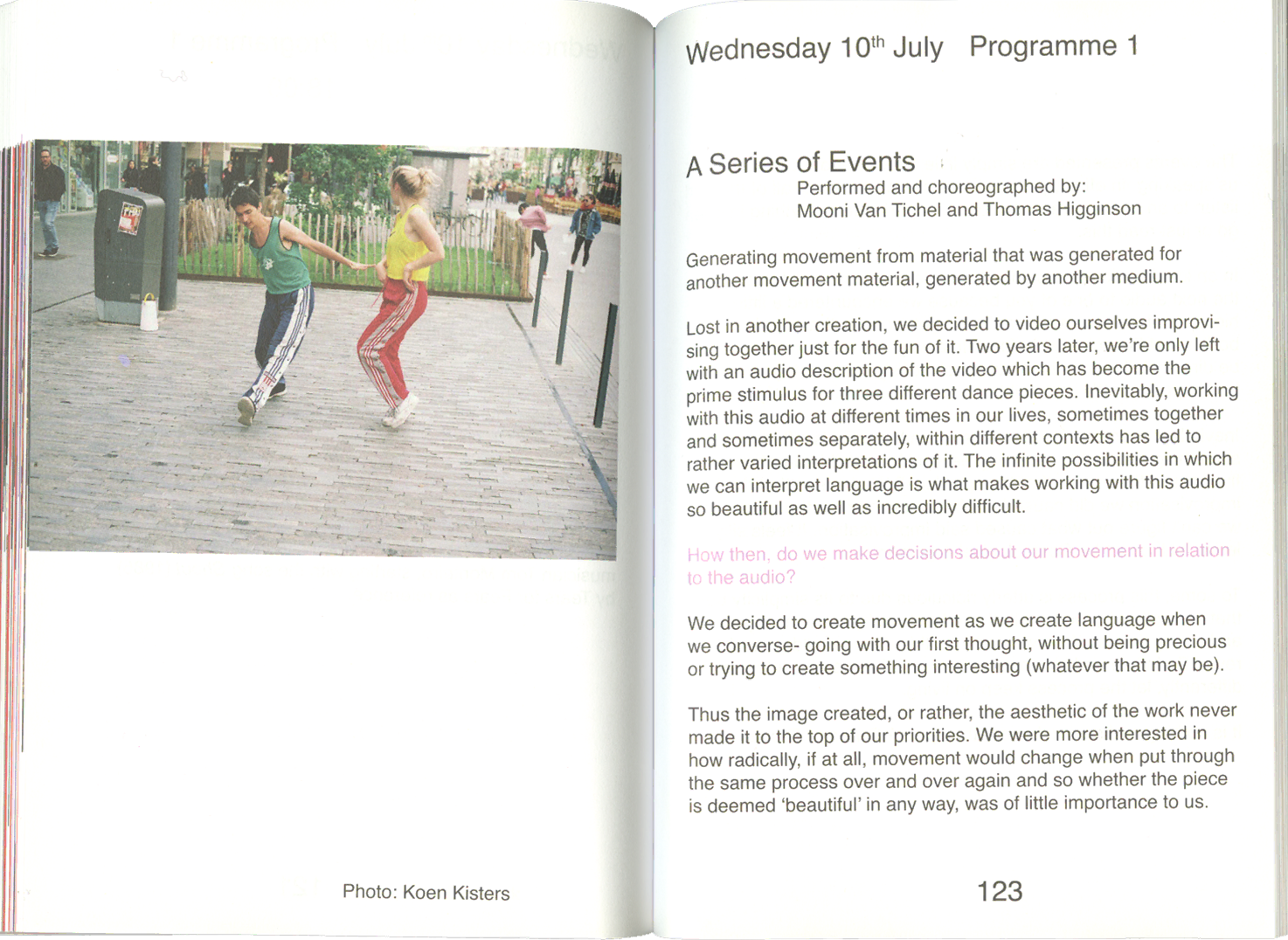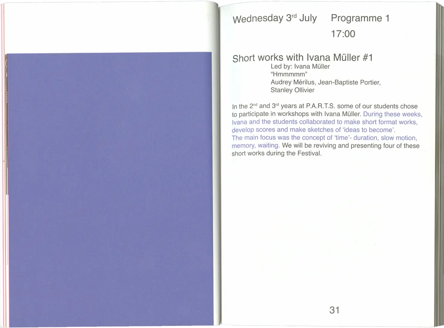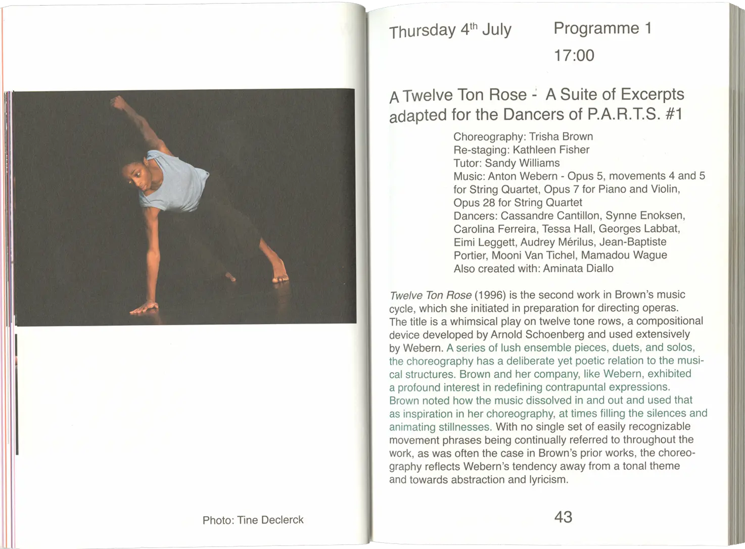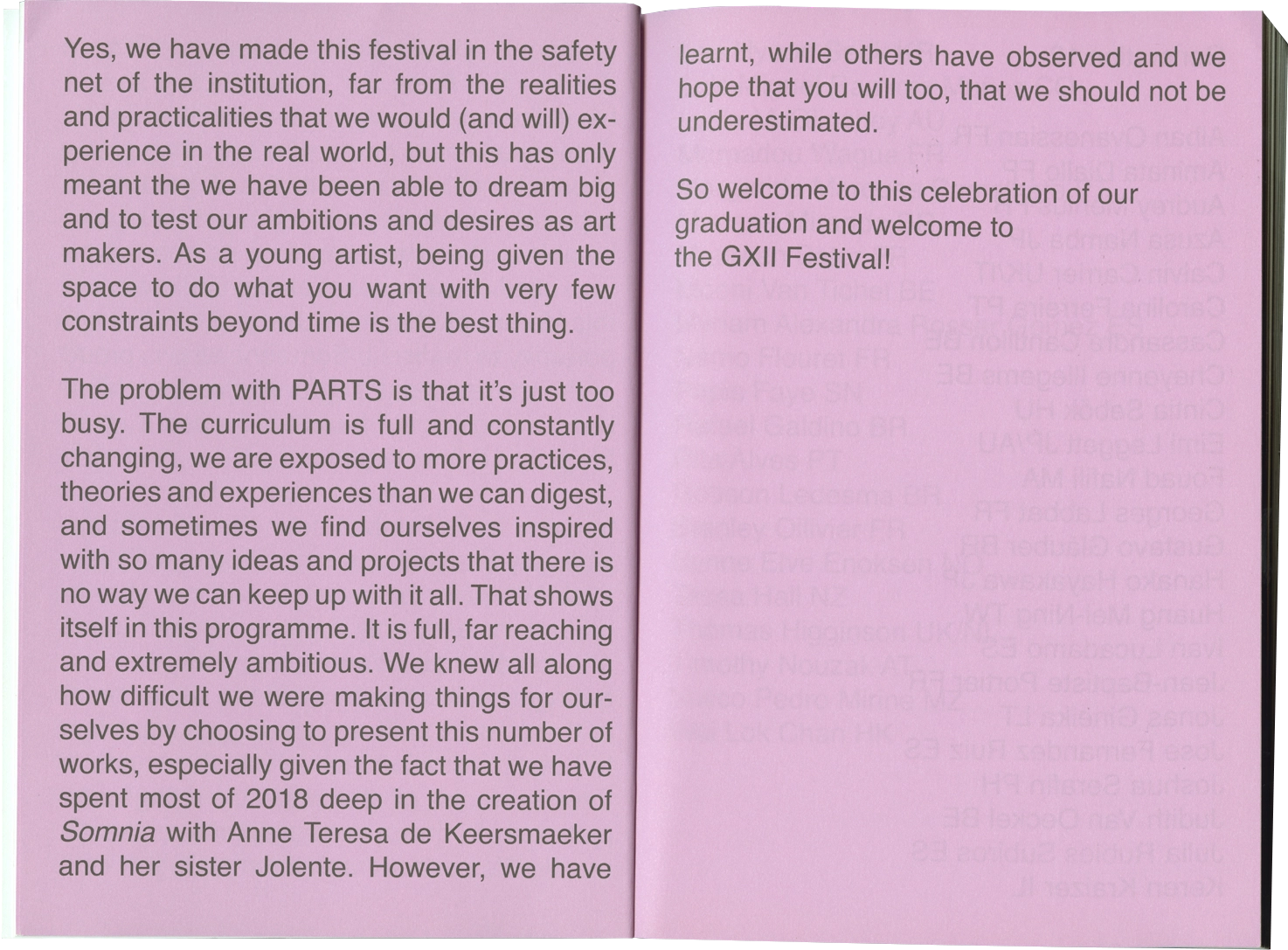 Every two years, the generation of students enrolled at P.A.R.T.S - Performing Arts Research and Training Studios (Belgium) - a school for contemporary dance founded by Anne Teresa De Keersmaeker in 1995, complete their master's program. This graduation culminates in a dance and performance festival.
