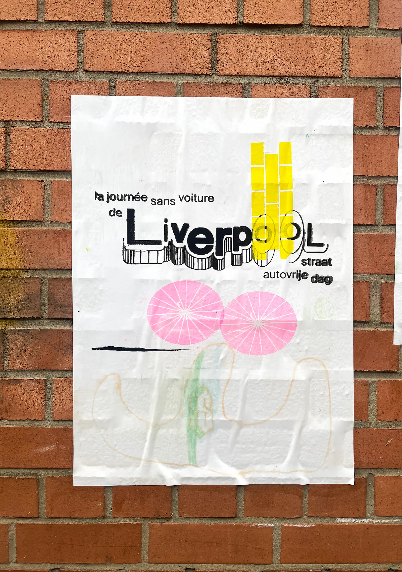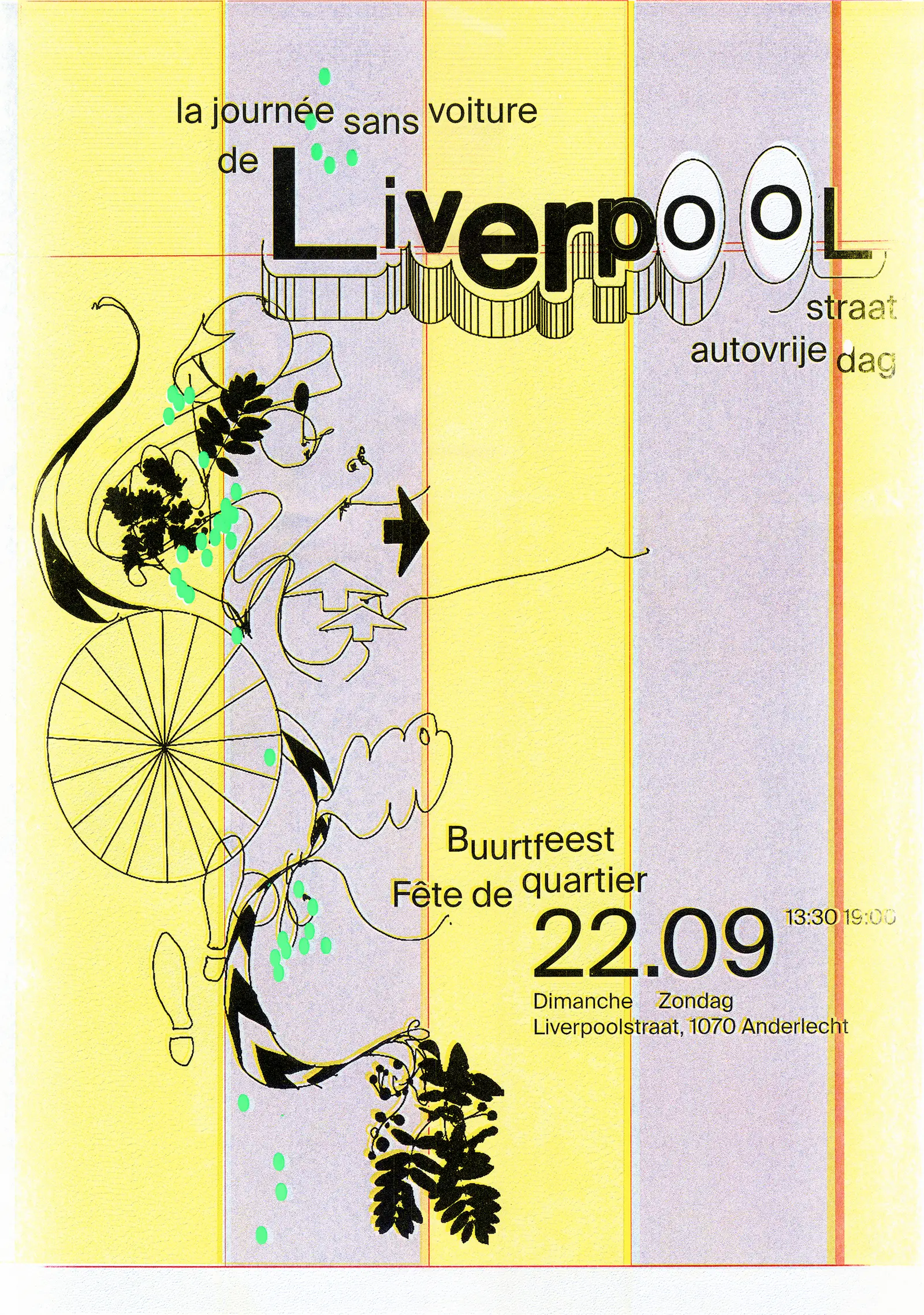 Liverpool car-free day is a public event in the neighboorhood of Cureghem (Belgium). At this occasion, people and communities throw a real block party! A poster is made to gathered all the associations and people involved in this event, among Gilbard collective. During the day, a series of screenprinting posters where made in collaboration with the neighbors and later been exposed on the street.