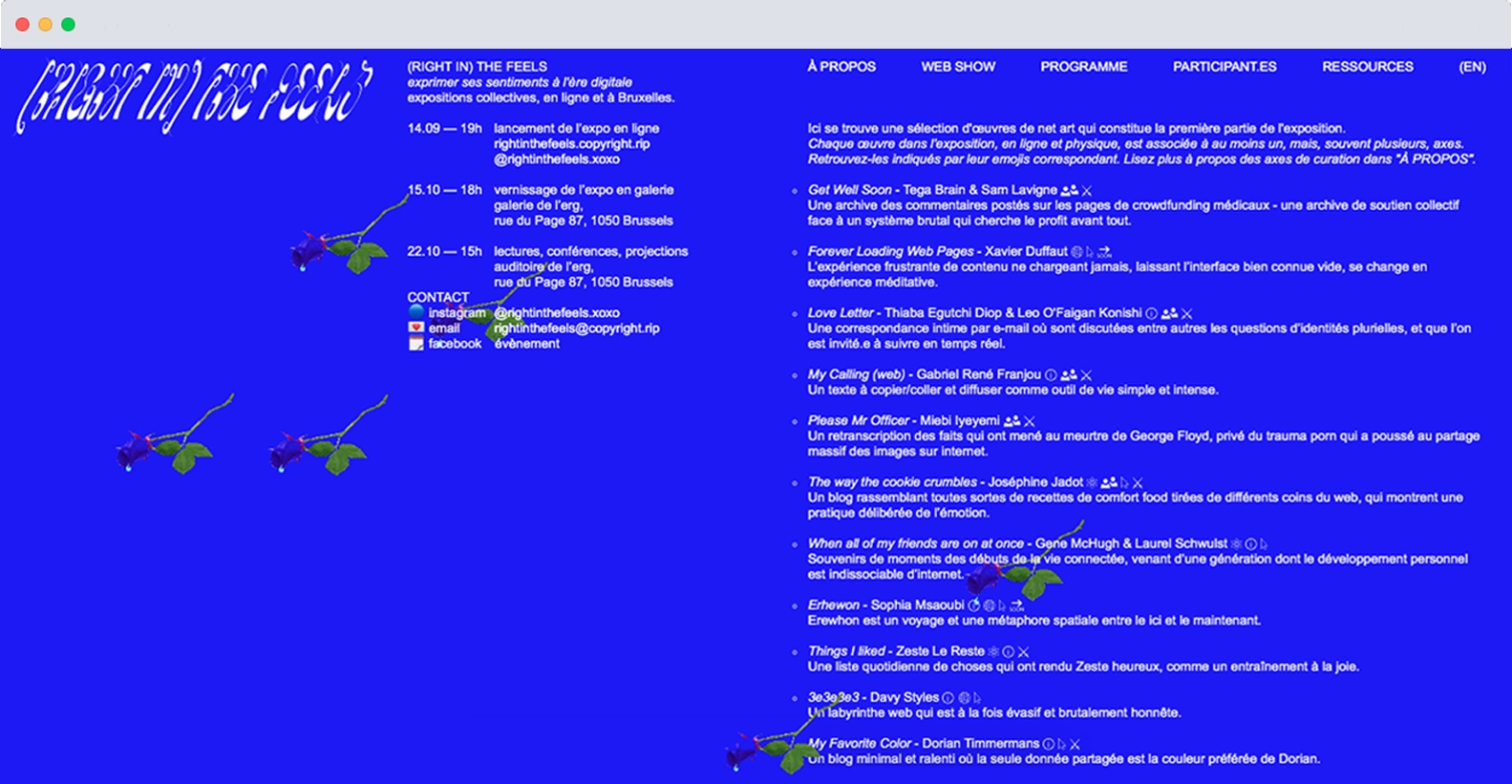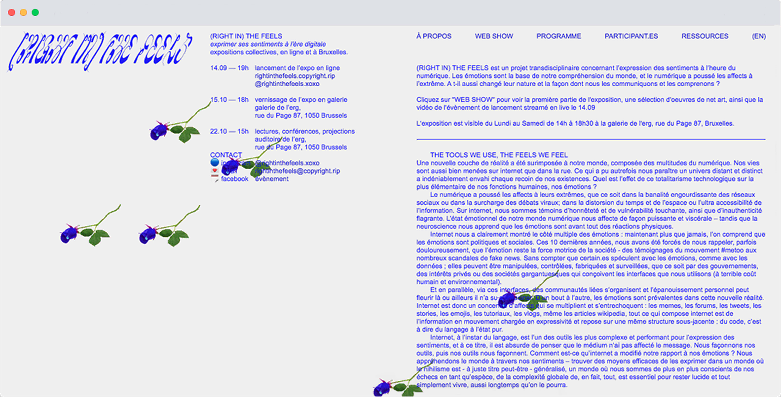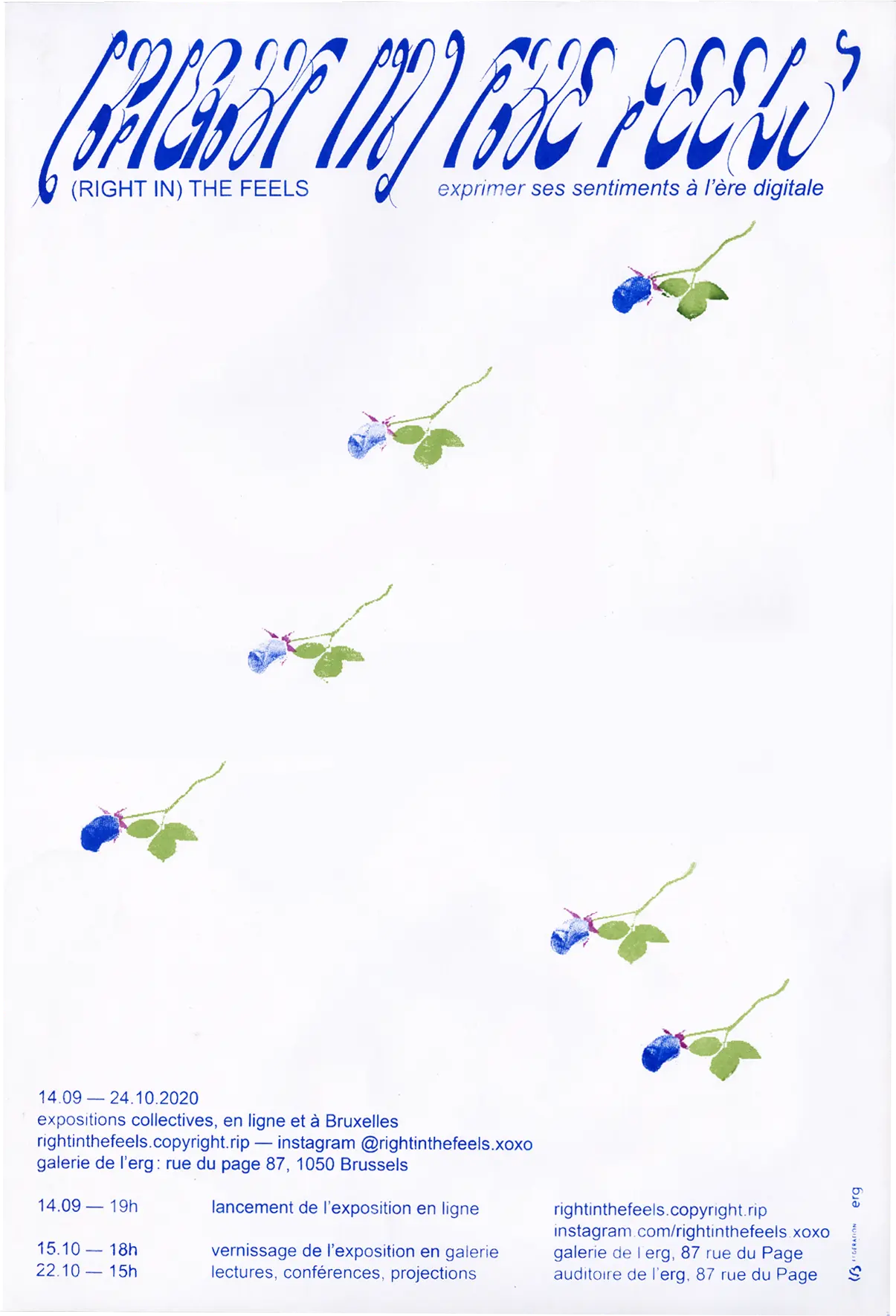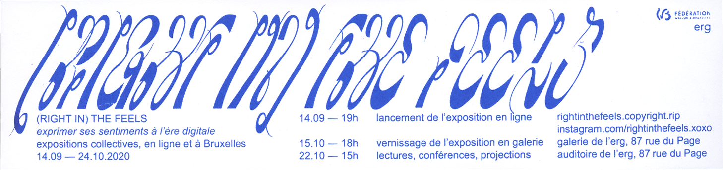 (RIGHT IN) THE FEELS is a vast group show - both online and in Brussels - that happened in 2020, questioning the expression of emotions in the digital age. Press kit can be downloaded here. An interview about this event with Switch (on paper) magazine can be read here (in French).