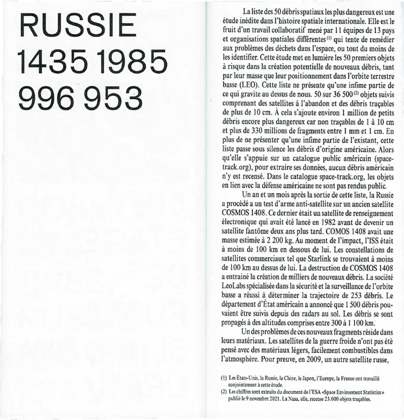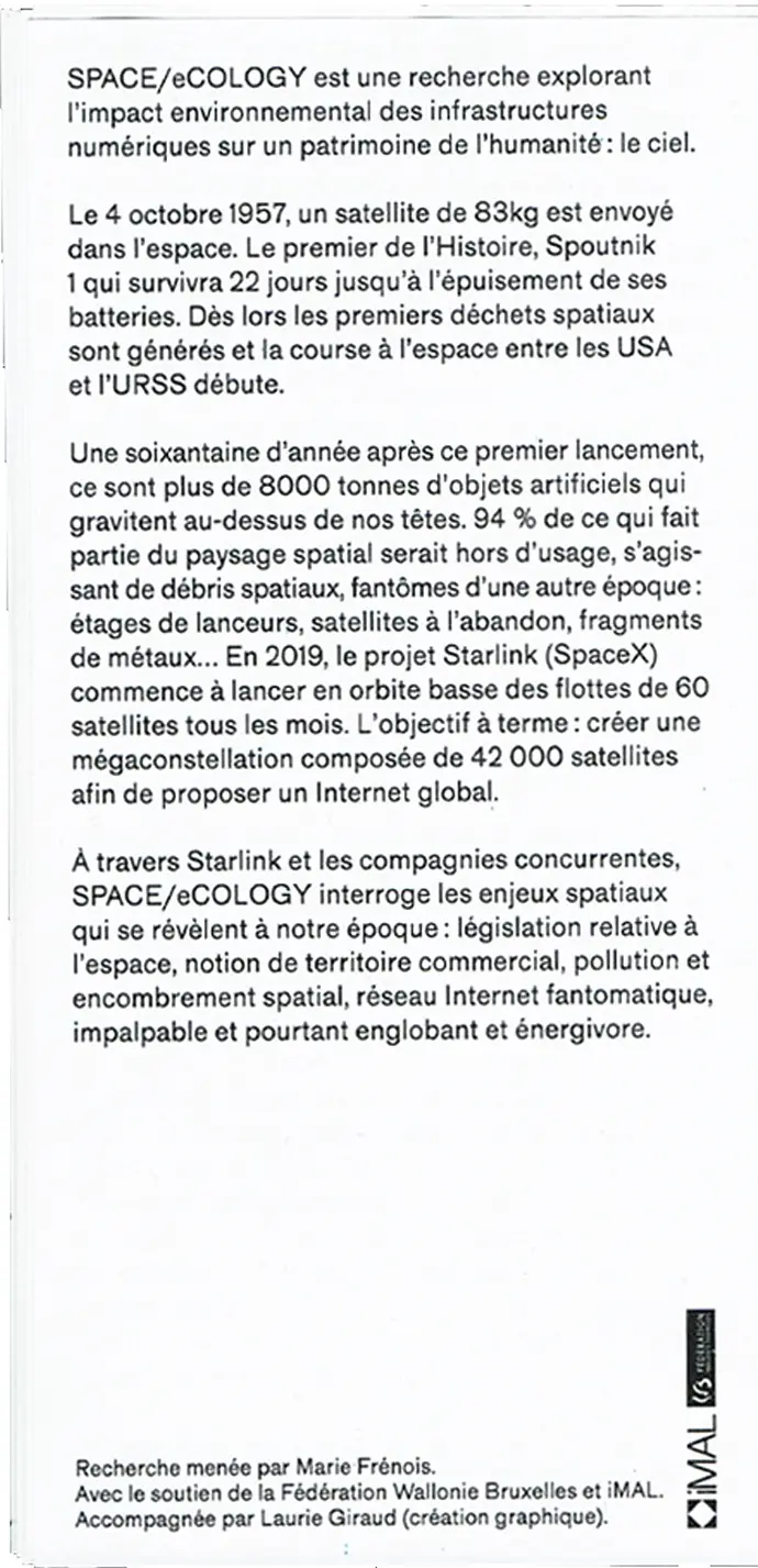 SPACE/eCOLOGY is an interdisciplinary research led by Marie Frénois, examining the environmental impact of digital infrastructures on the celestial vault. During her 2021 residency at iMAL, Marie created a leaflet titled "50/36,500 Objects in Orbit" and a website detailing the stories of 50 space objects out of the 36,500 cataloged in Earth's orbit.